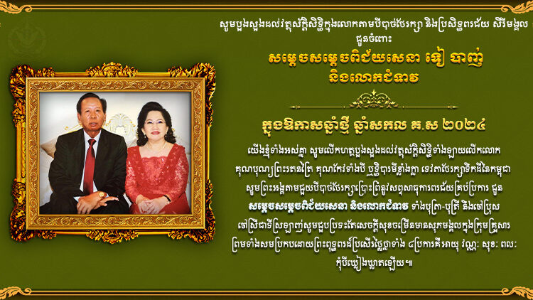 ក្នុងឱកាសដ៏មហោឡារិកនេះ យើងខ្ញុំទាំងអស់គ្នាសូមបួងសួងដល់គុណបុណ្យ ព្រះរតនត្រ័យ កែវទាំងបី វត្ថុស័ក្ដិសិទ្ធិក្នុងលោក និងទេវតាឆ្នាំថ្មី សូមប្រោះព្រំសព្ទសាធុការពរ សិរីសួស្ដី ជ័យមង្គលវិបុលសុខ បវរមហាប្រសើរថ្លៃថ្លាជូនចំពោះ សម្ដេចពិជ័យសេនា និងលោកជំទាវ សូមមានសុខភាពល្អបរិបូរណ៍ កម្លាំងពលំមាំមួន ប្រាជ្ញាភ្លឺថ្លា ជន្មាយុយឺនយូរ ឈ្នះអស់មារសត្រូវ គ្រប់ទិសទី និងទទួលបានជោគជ័យថ្មីបន្ថែមទៀត ក្នុងបុព្វហេតុជាតិ មាតុភូមិ ប្រជាជនប្រកបដោយការអភិវឌ្ឍ និងរីកចម្រើនត រៀងទៅ។