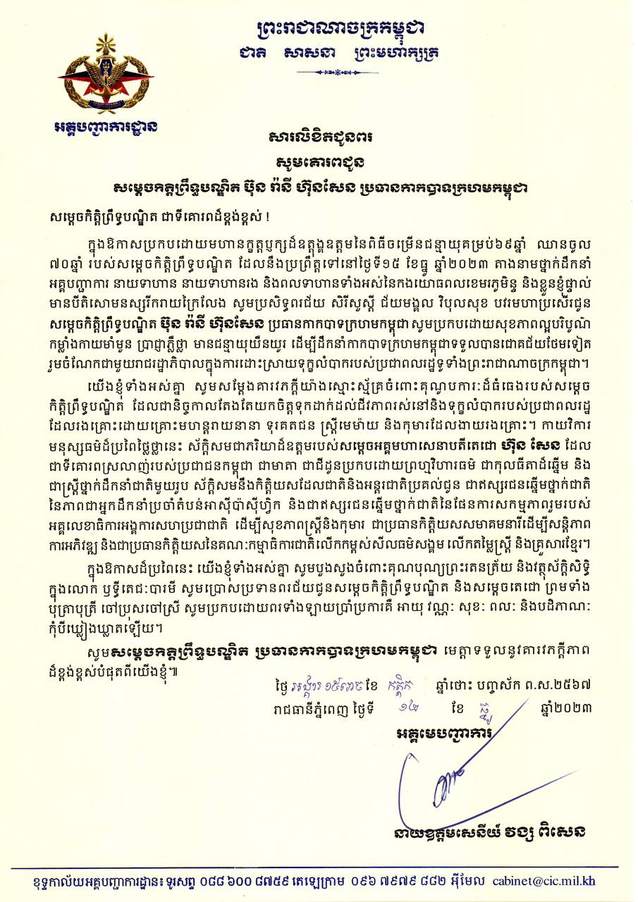 យើងខ្ញុំទាំងអស់គ្នា សូមអនុញ្ញាតសម្តែងនូវសោមន្សរីករាយ ដោយស្មោះអស់ពីដួងចិត្ត និងចូលរួមជូននូវសព្ទសាធុការពរជ័យ បវរមហាប្រសើរគោរពជូន សម្តេចកិត្តិព្រឹទ្ធបណ្ឌិត សូមប្រកបដោយសុខភាពល្អបរិបូរណ៍ កម្លាំងពលំមាំមួន អាយុយឺនយូរ និងប្រាជ្ញាឈ្លាសវៃ ដើម្បីដឹកនាំកាកបាទក្រហមកម្ពុជា ឱ្យសម្រេចបាននូវលទ្ធផលផ្លែផ្កាថ្មីៗជាច្រើនថែមទៀត ដែលជាបេសកកម្មដ៏ឧត្តុង្គឧត្តមរបស់ សម្តេចកិត្តិព្រឹទ្ធបណ្ឌិត ចំពោះប្រជាជន និងជាតិមាតុភូមិកម្ពុជា។