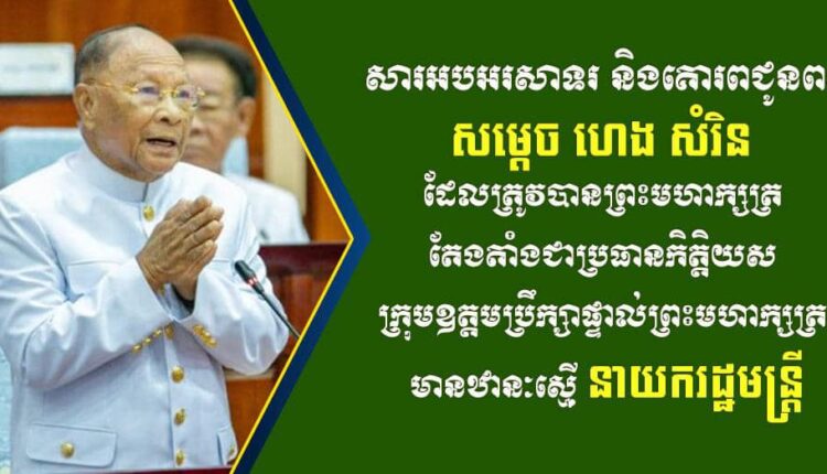នាយឧត្តមសេនីយ៍ វង្ស ពិសេន សូមអបអរសាទរ និងគោរពជូនពរ សម្តេច ហេង សំរិន ដែលត្រូវបានព្រះមហាក្សត្រ តែងតាំងជាប្រធានកិត្តិយស ក្រុមឧត្តមប្រឹក្សាផ្ទាល់ព្រះមហាក្សត្រ មានឋានៈស្មើ នាយករដ្ឋមន្ដ្រី