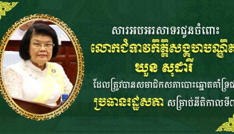នាយឧត្តមសេនីយ៍ វង្ស ពិសេន សូមអបអរសាទរ និងជូនពរជូនចំពោះ លោកជំទាវ កិត្តិសង្គហបណ្ឌិត ឃួន សុដារី ដែលត្រូវបានរដ្ឋសភាបោះឆ្នោតគាំទ្រជា ប្រធានរដ្ឋសភា នីតិកាលទី៧