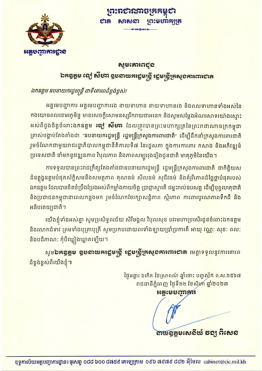 នាយឧត្តមសេនីយ៍ វង្ស ពិសេន សូមអបអរសាទរ និងគោរពជូនពរ ឯកឧត្ដម ទៀ សីហា ដែលត្រូវបានព្រះមហាក្សត្រ តែងតាំងជា ឧបនាយករដ្ឋមន្ត្រី រដ្ឋមន្ត្រីក្រសួងការពារជាតិ