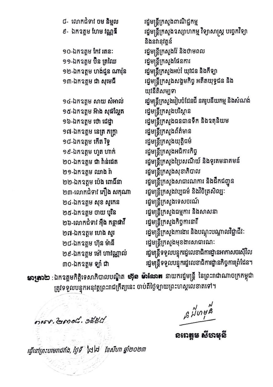 ព្រះមហាក្សត្រ ចេញព្រះរាជក្រឹត្យ តែងតាំងគណៈរដ្ឋមន្រ្តីថ្មី ដែលមាន ឯកឧត្តមកិត្តិទេសាភិបាលបណ្ឌិត ហ៊ុន ម៉ាណែត ជានាយករដ្ឋមន្រ្តី