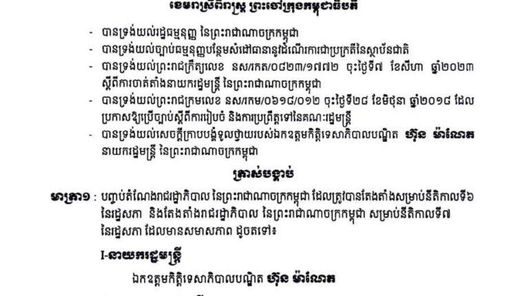 ព្រះមហាក្សត្រ ចេញព្រះរាជក្រឹត្យ តែងតាំងគណៈរដ្ឋមន្រ្តីថ្មី ដែលមាន ឯកឧត្តមកិត្តិទេសាភិបាលបណ្ឌិត ហ៊ុន ម៉ាណែត ជានាយករដ្ឋមន្រ្តី