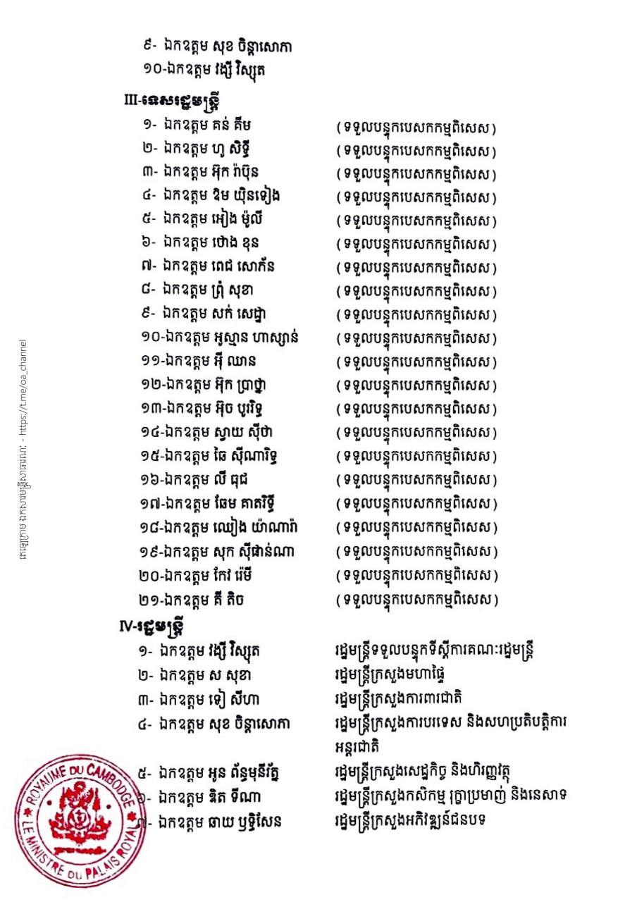 ការចេញព្រះរាជក្រឹត្យតែងតាំងគណៈរដ្ឋមន្រ្តីថ្មីនេះ បានធ្វើឡើងបន្ទាប់ពីរដ្ឋសភា បានបោះឆ្នោតអនុម័តគាំទ្រទាំងស្រុងទៅលើសមាសភាពគណៈរដ្ឋមន្រ្តី ដែលរៀបចំដោយ ឯកឧត្តមកិត្តិទេសាភិបាលបណ្ឌិត ហ៊ុន ម៉ាណែត។
