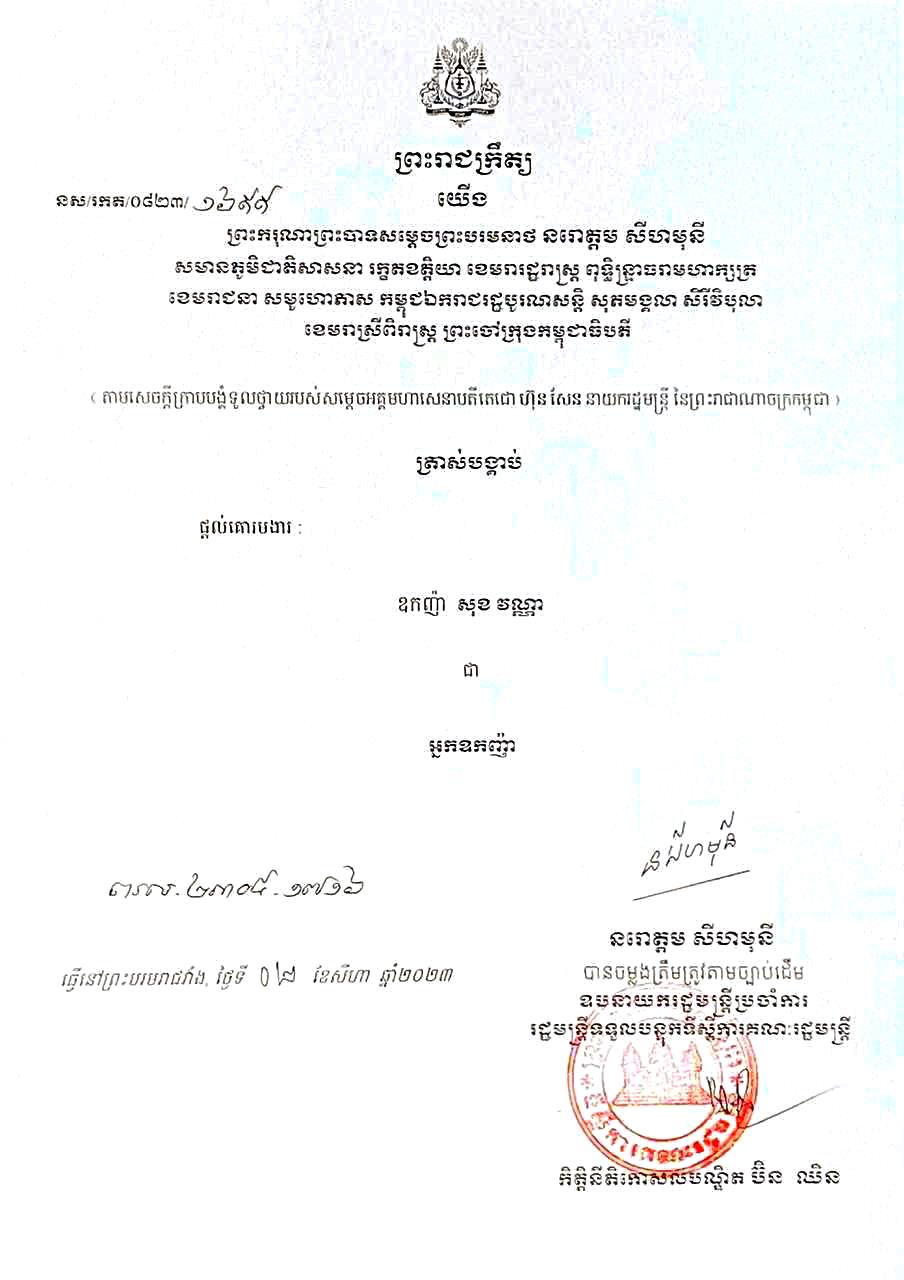 នេះបើតាមព្រះរាជក្រឹត្យ ដែលបណ្តាញព័ត៌មាន ទទួលបាននៅថ្ងៃទី៩ ខែសីហា ឆ្នាំ២០២៣នេះ។