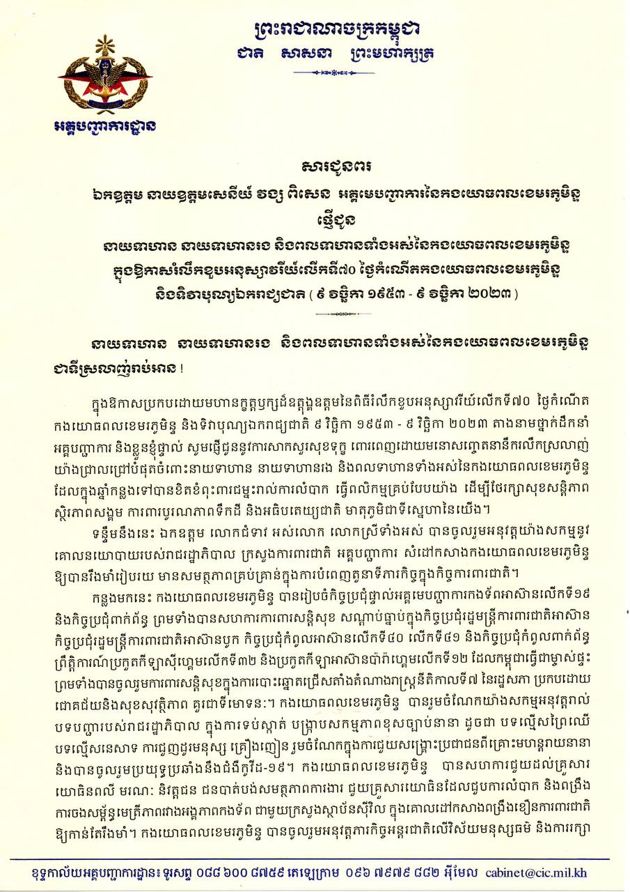 អគ្គមេបញ្ជាការ កងយោធពលខេមរភូមិន្ទ ផ្ញើសារជូនពរដល់នាយទាហាន នាយទាហានរង និងពលទាហានទាំងអស់ក្នុងឱកាសកំណើតកងយោធពលខេមរភូមិន្ទ