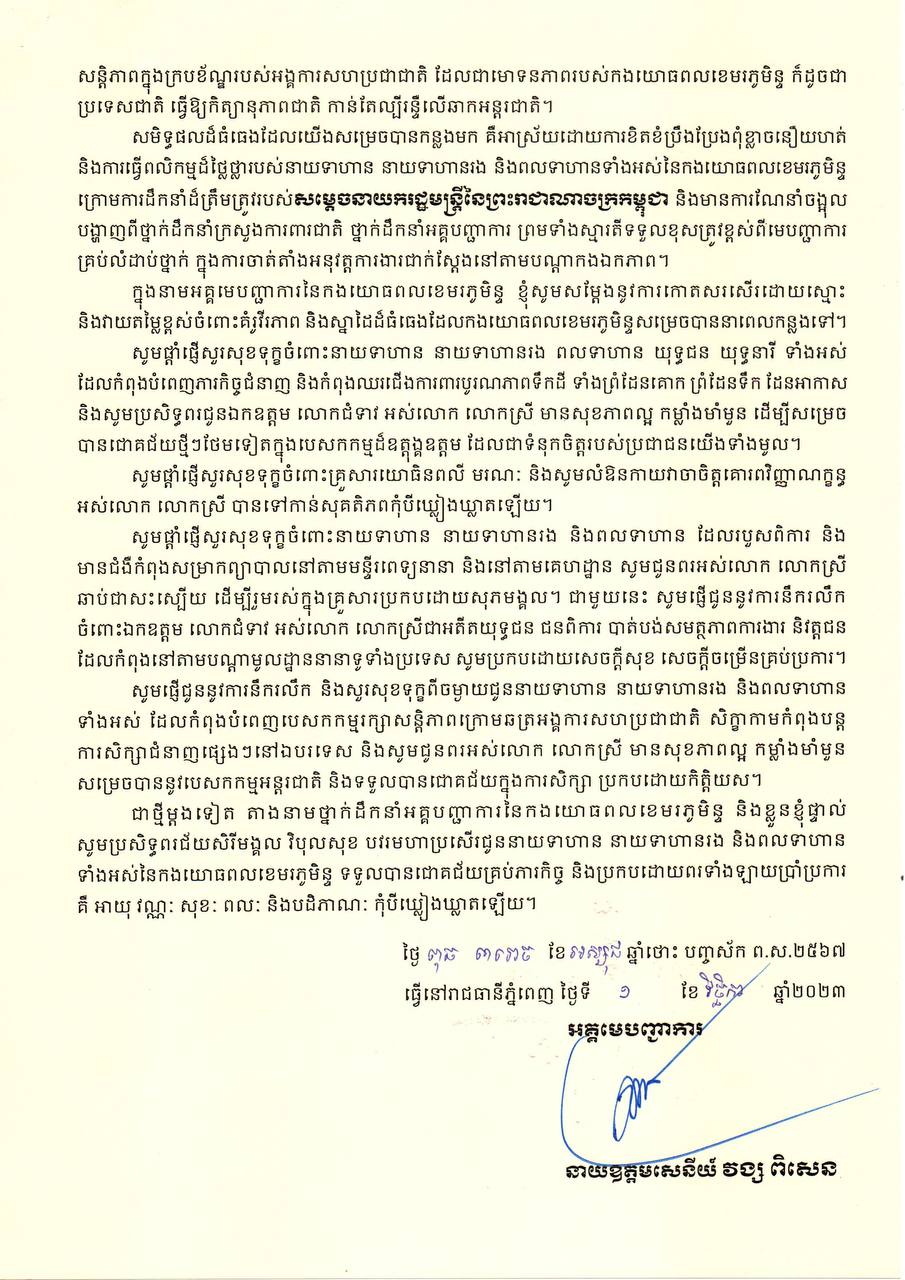 ខាងក្រោមជាខ្លឹមសារជូនពររបស់ អគ្គមេបញ្ជាការ កងយោធពលខេមរភូមិន្ទ៖