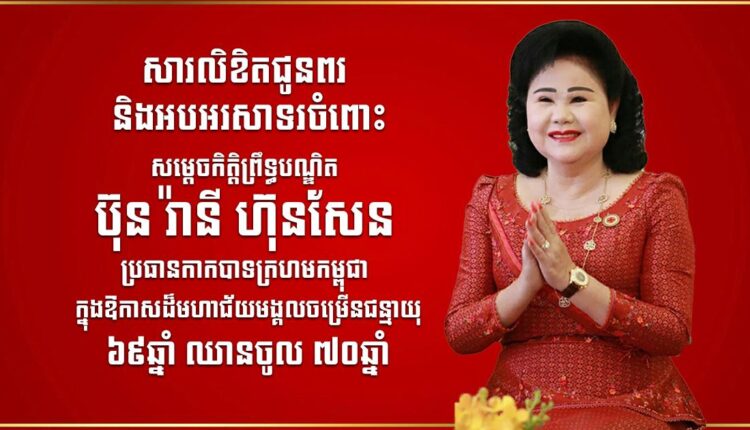 យើងខ្ញុំទាំងអស់គ្នា សូមអនុញ្ញាតសម្តែងនូវសោមន្សរីករាយ ដោយស្មោះអស់ពីដួងចិត្ត និងចូលរួមជូននូវសព្ទសាធុការពរជ័យ បវរមហាប្រសើរគោរពជូន សម្តេចកិត្តិព្រឹទ្ធបណ្ឌិត សូមប្រកបដោយសុខភាពល្អបរិបូរណ៍ កម្លាំងពលំមាំមួន អាយុយឺនយូរ និងប្រាជ្ញាឈ្លាសវៃ ដើម្បីដឹកនាំកាកបាទក្រហមកម្ពុជា ឱ្យសម្រេចបាននូវលទ្ធផលផ្លែផ្កាថ្មីៗជាច្រើនថែមទៀត ដែលជាបេសកកម្មដ៏ឧត្តុង្គឧត្តមរបស់ សម្តេចកិត្តិព្រឹទ្ធបណ្ឌិត ចំពោះប្រជាជន និងជាតិមាតុភូមិកម្ពុជា។