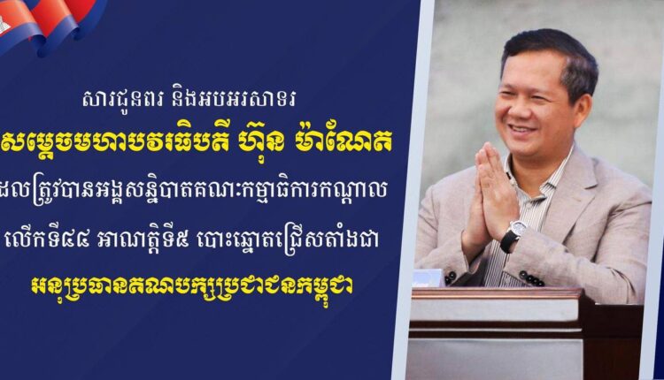 ឧត្តមសេនីយ៍ឯក មាស វណ្ណា ផ្ញើសារជូនពរ និងអបអរសាទរ សម្តេចមហាបវរធិបតី ហ៊ុន ម៉ាណែត ដែលត្រូវបានអង្គសន្និបាតគណៈកម្មាធិការកណ្តាល លើកទី៤៤ អាណត្តិទី៥ បោះឆ្នោតជ្រើសតាំងជា អនុប្រធានគណបក្សប្រជាជនកម្ពុជា