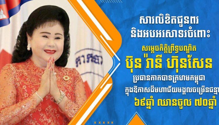 យើងខ្ញុំទាំងអស់គ្នា សូមអនុញ្ញាតសម្តែងនូវសោមន្សរីករាយ ដោយស្មោះអស់ពីដួងចិត្ត និងចូលរួមជូននូវសព្ទសាធុការពរជ័យ បវរមហាប្រសើរគោរពជូន សម្តេចកិត្តិព្រឹទ្ធបណ្ឌិត សូមប្រកបដោយសុខភាពល្អបរិបូរណ៍ កម្លាំងពលំមាំមួន អាយុយឺនយូរ និងប្រាជ្ញាឈ្លាសវៃ ដើម្បីដឹកនាំកាកបាទក្រហមកម្ពុជា ឱ្យសម្រេចបាននូវលទ្ធផលផ្លែផ្កាថ្មីៗជាច្រើនថែមទៀត ដែលជាបេសកកម្មដ៏ឧត្តុង្គឧត្តមរបស់ សម្តេចកិត្តិព្រឹទ្ធបណ្ឌិត ចំពោះប្រជាជន និងជាតិមាតុភូមិកម្ពុជា។