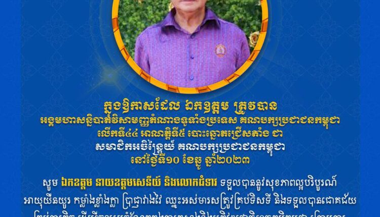 (ភ្នំពេញ)៖ ឯកឧត្ដម ហួត ឈាងអន សមាជិកគណៈកម្មាធិការកណ្ដាល គណបក្សប្រជាជនកម្ពុជា បានផ្ញើសារអបអរសាទរ និងជូនពរចំពោះ ឯកឧត្ដម ម៉ៅ សុផាន់ ប្រធានក្រុមការងាររាជរដ្ឋាភិបាលចុះជួយមូលដ្ឋានខេត្តព្រះវិហារ ក្នុងឱកាសដែល ឯកឧត្ដម ត្រូវបានអង្គមហាសន្និបាតវិសាមញ្ញតំណាងទូទាំងប្រទេស គណបក្សប្រជាជនកម្ពុជា លើកទី៤៤ អាណត្តិទី៥ នាថ្ងៃទី១០ ខែធ្នូ ឆ្នាំ២០២៣ បោះឆ្នោតសម្រេចជ្រើសតាំងជា សមាជិកអចិន្ត្រៃយ៍ គណបក្សប្រជាជនកម្ពុជា។